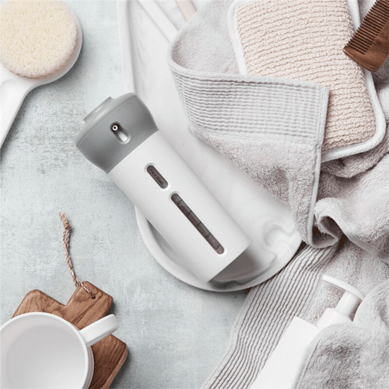 Tu rutina de cuidado personal, maquillaje y limpieza ahora cabe en un solo dispensador compacto de 4 botellas recargables de 40 ml cada una.